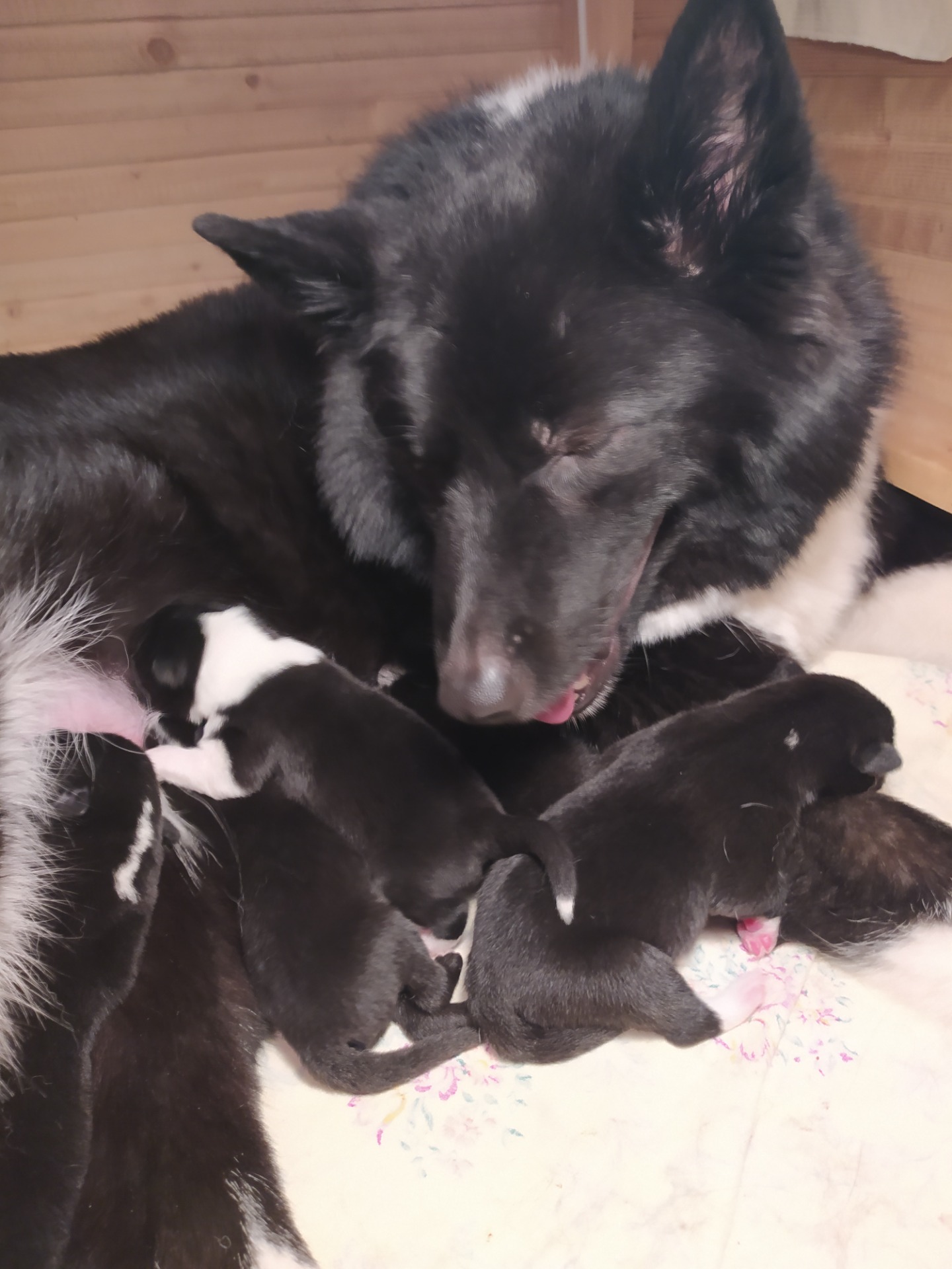 Ráno 2.3.2022 se mezi třetí a sedmou hodinou ranní narodil náš první vrh "A". Fazinka vše zvládla a narodilo se pět štěňat. První vykoukl na svět kluk - s bílou čárkou na krku Ax, druhá vykoukla na svět fenka Arya - s neuzavřeným bílým límcem, následoval kluk - s největším podílem bílé barvy Arés. Čtvrtá v pořadí je fenka Afra...